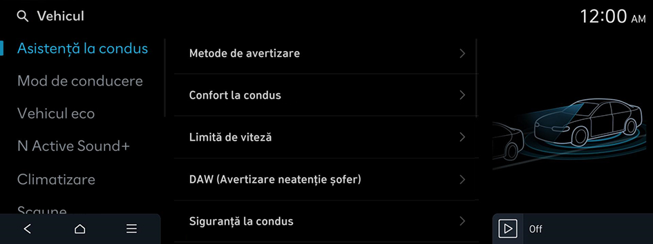 Asigurați-vă că ați oprit vehiculul înainte de modificarea setărilor, pentru garantarea siguranței.