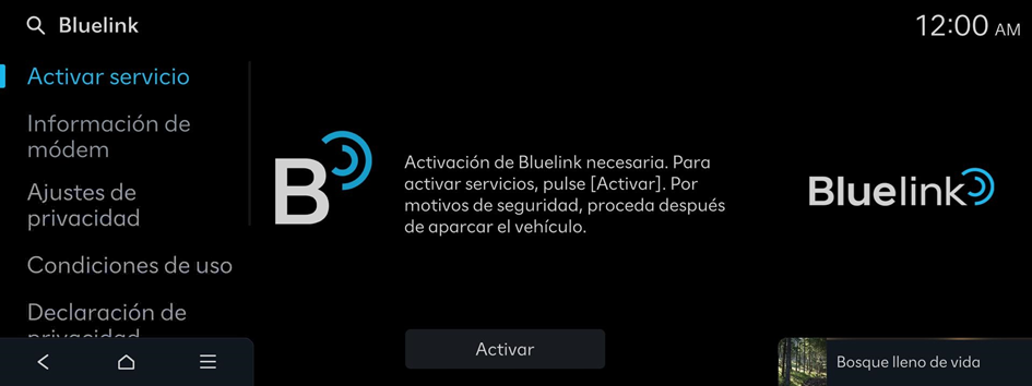 - En la pantalla de inicio, pulse Ajustes ▶ Bluelink ▶ Activar servicio.