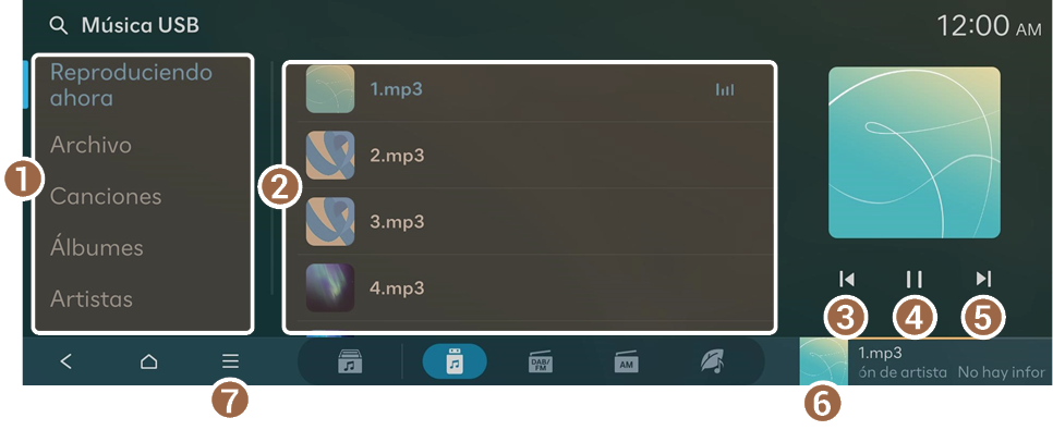 - Se muestra la pantalla del reproductor de música USB.