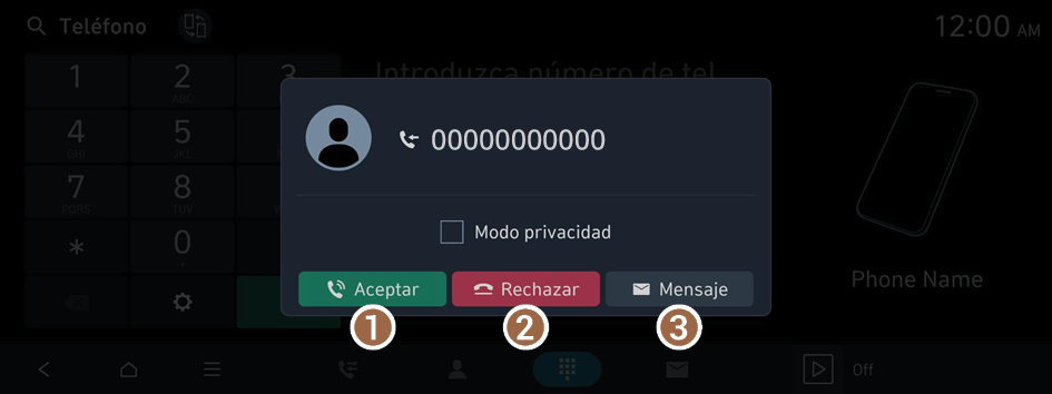 Si ha conectado un teléfono móvil a través de Bluetooth, en la pantalla se mostrará el nombre o el número de teléfono del emisor durante una llamada entrante.