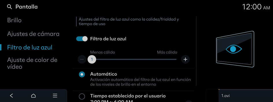 Ajustes del filtro de luz azul como la calidez/frialdad y tiempo de uso