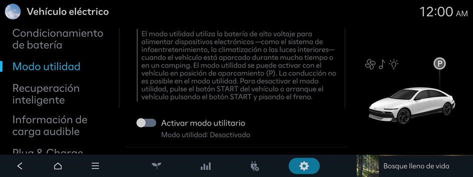 El modo utilidad utiliza la batería de alto voltaje para los dispositivos electrónicos como el sistema de infoentretenimiento, control de climatización o luces interiores, cuando se está aparcado durante mucho tiempo o haciendo camping.