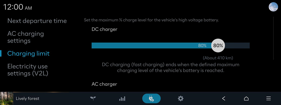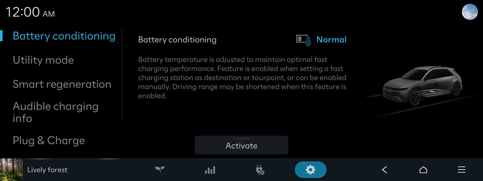 Battery temperature is adjusted to maintain optimal fast charging performance. The feature is enabled when setting a fast charging station as destination or stop-off, or can be enabled manually. Driving range may be shortened when this feature is enabled.