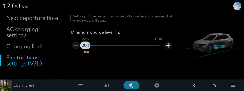 Setting of the minimum battery charge level (in percent) at which V2L will stop.