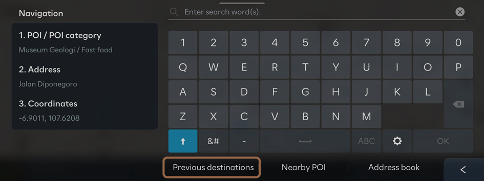 - On the Search screen, press Previous destinations.