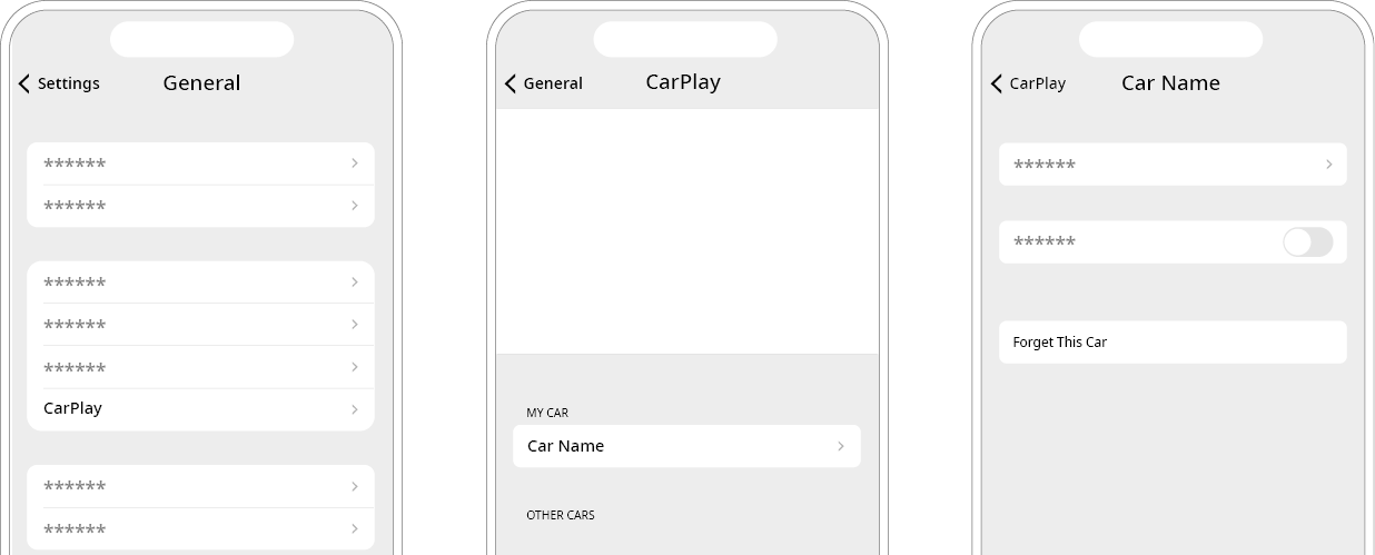 On the iPhone screen, press Settings ▶ General ▶ CarPlay, select the vehicle to disconnect, and then press Forget This Car.