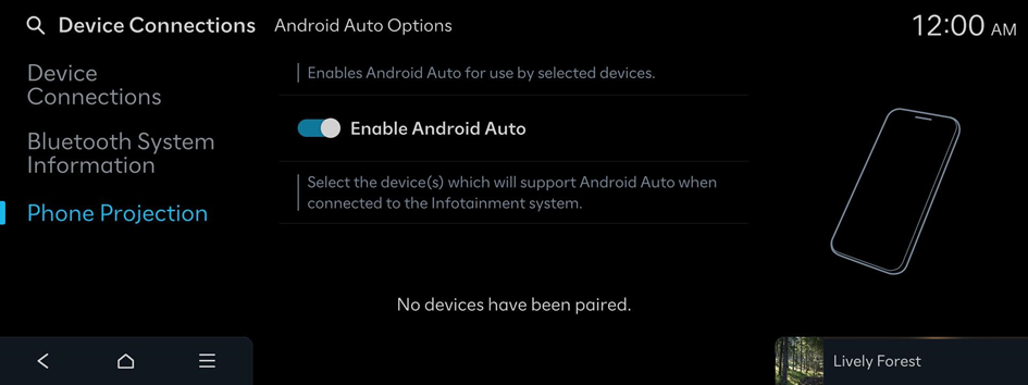 1. On the Home screen, press Setup Device Connections Phone Projection Android Auto Options and then enable Enable Android Auto.