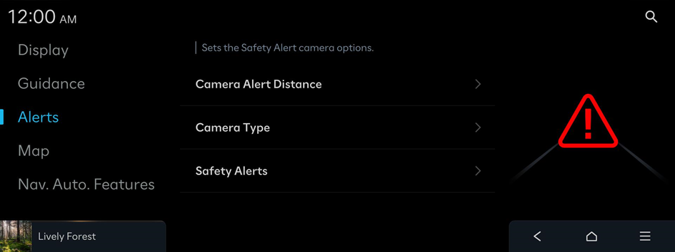 - • Camera Alert Distance Depending on the Speed Limit: Automatically sets the time when to get alerts about traffic enforcement cameras depending on the vehicle speed. When the Camera Alert Distance Depending on the Speed Limit function is off, the time when to get guidance on traffic enforcement cameras on Camera Alert Distance (Local Roads) and Camera Alert Distance (Expressway) can be selected.