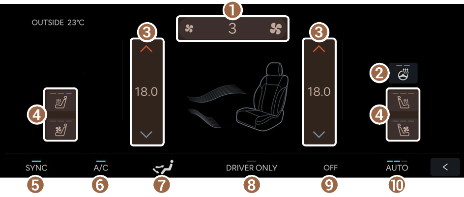 - 運転席の空調機能のオンとオフを切替えます。(装備されている場合)