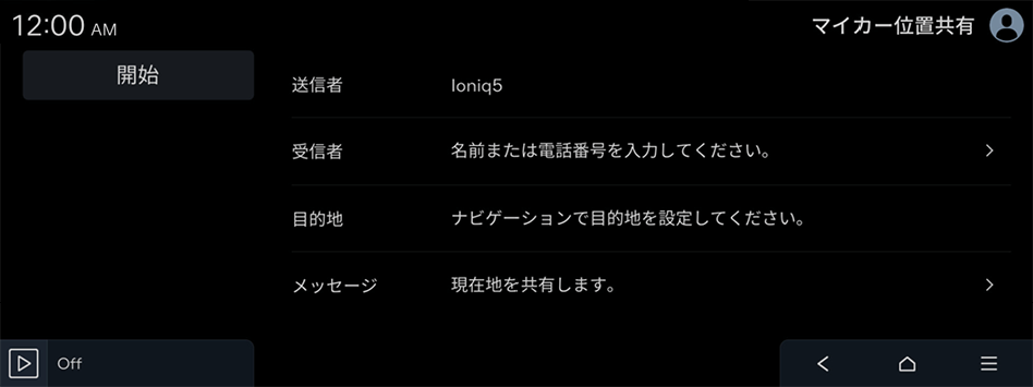 - 車両電源が停止している場合、位置情報は共有できません。車両電源を始動すると、位置情報を共有できます。