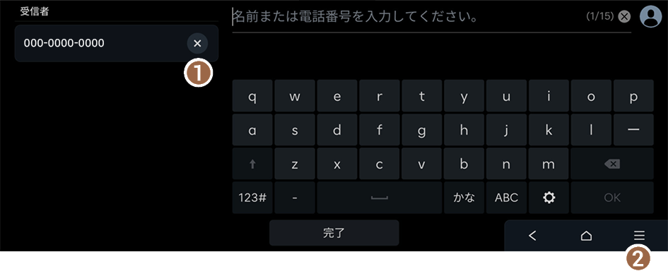 - 車両位置データを受信する相手の電話番号入力方法は、次をご覧ください。 ▶ 「電話番号入力画面」をご覧ください。
