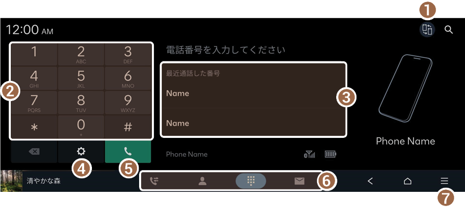 - 電話画面の下部タブにある