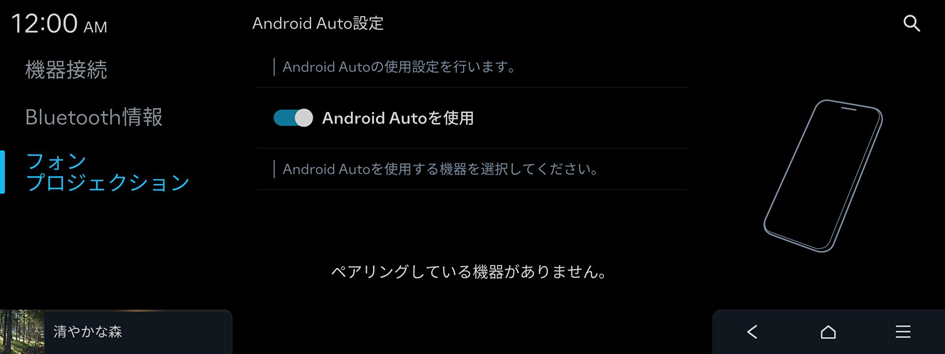 - ホーム画面で、設定 ▶ 機器接続 ▶ フォンプロジェクション ▶ Android Auto設定を押してから、Android Autoを使用を有効にします。