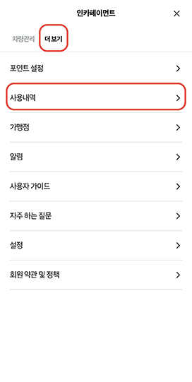 On the myHyundai App, press 마이 ▶ 인카페이먼트 ▶ 더 보기 ▶ 사용내역.