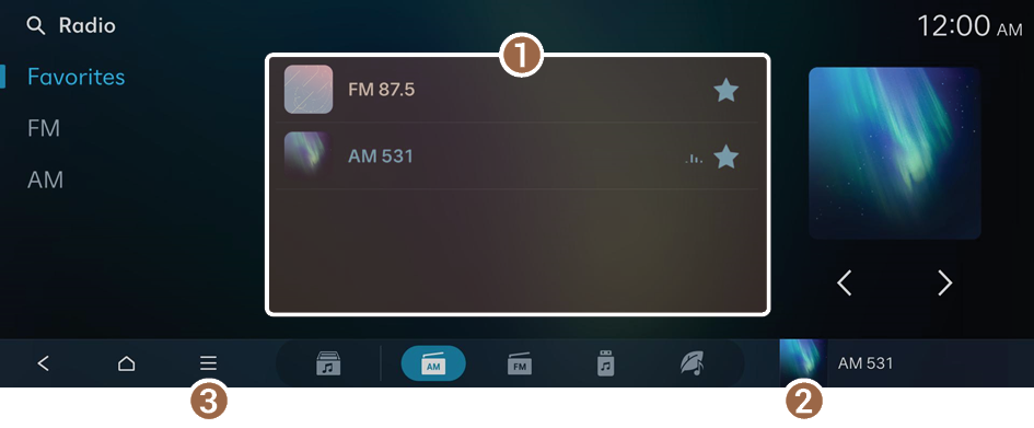 . - • You can save all stations, accessible from the AM screen, to the favorites list. On the AM screen, press