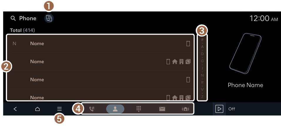 The contacts saved on your mobile phone are downloaded. You can make a call by selecting a contact from the system screen.