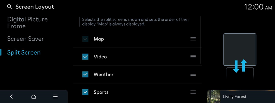 Selects the split screens shown and sets the order of their display. 'Map' is always displayed.