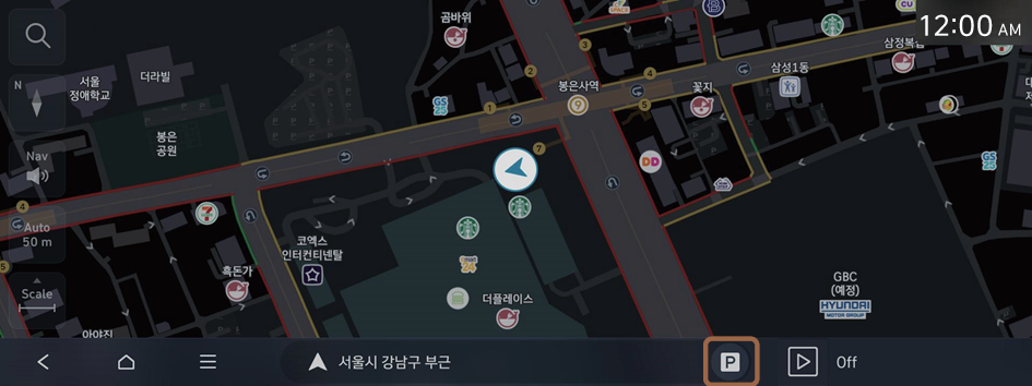 지도 화면 우측에 차량의 현재 위치가 아이콘으로 표시됩니다. 다른 층을 선택하면 해당 층으로 차량의 위치가 변경되며 선택한 층이 지도 화면에 표시됩니다.