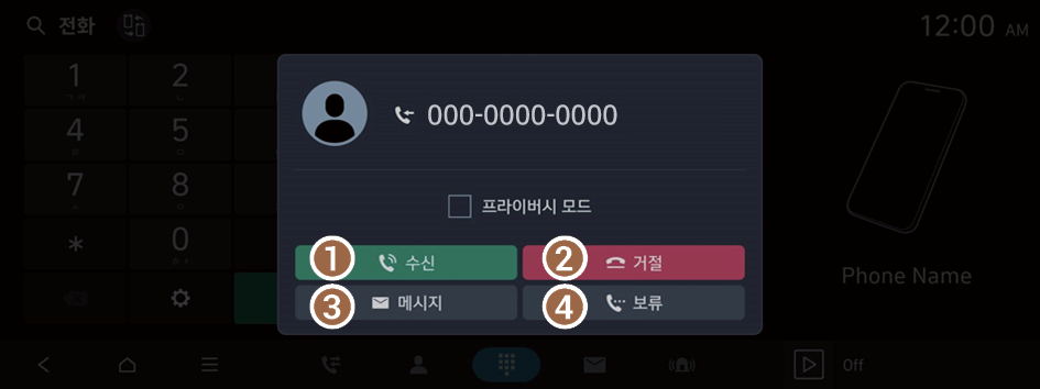 - 프라이버시 모드가 설정된 상태에서 전화가 오면 자동으로 수신 보류 상태로 전환합니다.