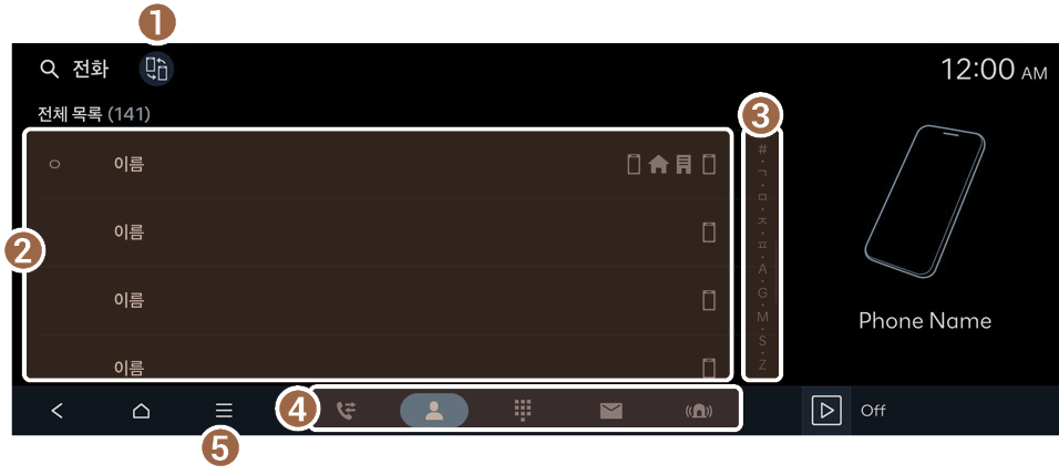 휴대 전화에 저장된 연락처가 다운로드되며, 시스템 화면에서 연락처를 선택해 전화를 걸 수 있습니다.