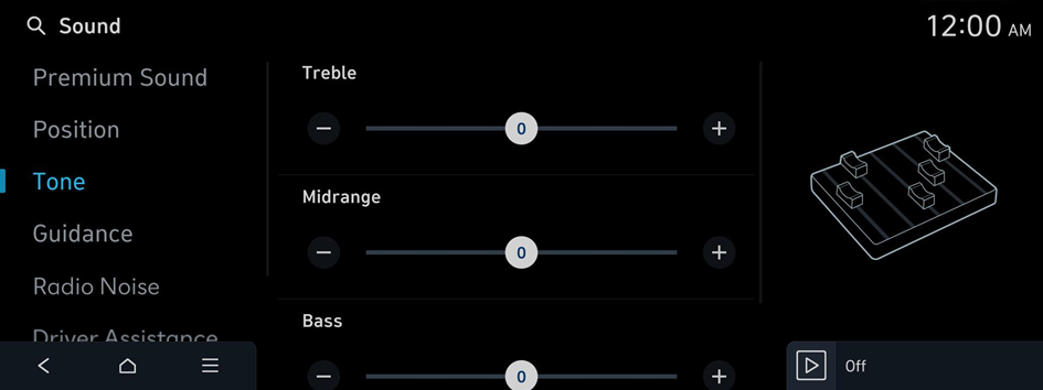 Adjust the sound by adjusting the strength (output level) for each audio band: Bass, Midrange, and Treble.