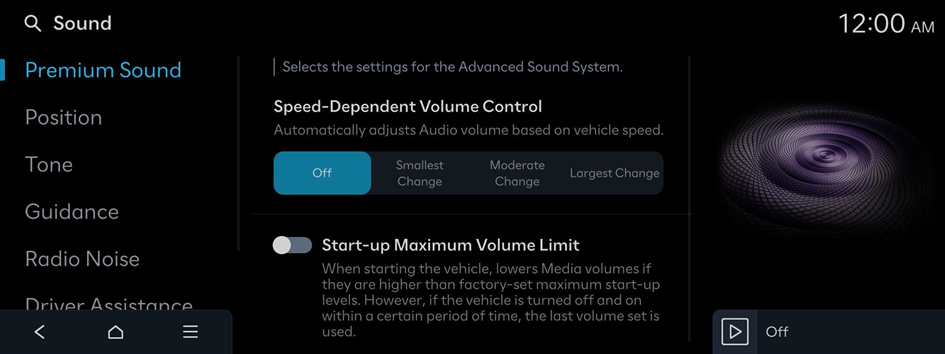 When starting the vehicle, lowers Media volumes if they are higher than factory-set maximum start-up levels. However, if the vehicle is turned off and on within a certain period of time, the last volume set is used.