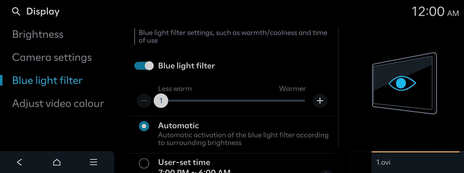 Blue light filter settings, such as warmth/coolness and time of use