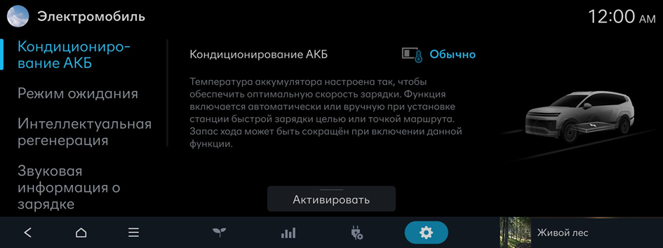 Температура аккумулятора настроена так, чтобы обеспечить оптимальную скорость зарядки. Функция включается автоматически или вручную при установке станции быстрой зарядки целью или точкой маршрута. Запас хода может быть сокращён при включении данной функции.