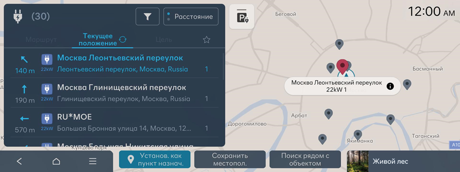 Если расстояние до установленного пункта назначения превышает запас хода, можно использовать функцию, которая построит маршрут с зарядными станциями в пределах запаса хода.