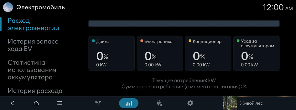 Можно получить сведения о количестве электроэнергии, использованной ходовой частью, системой климат-контроля, электросистемами и функцией ухода за аккумулятором.