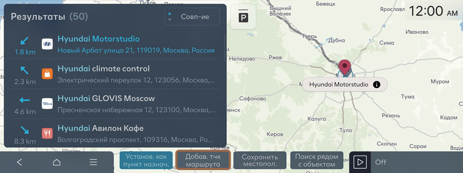 - Используйте удобный для вас способ поиска промежуточной точки. ▶ См. раздел «Простой поиск маршрута», «Поиск среди последних целей», «Поиск ближайших интересных мест».