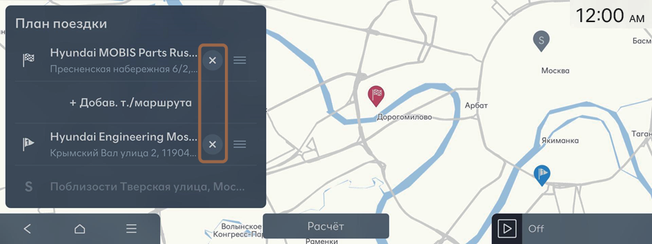 рядом с названием пункта назначения, чтобы удалить его. - Для повторного прокладывания маршрута после удаления промежуточной точки нажмите Расчёт.