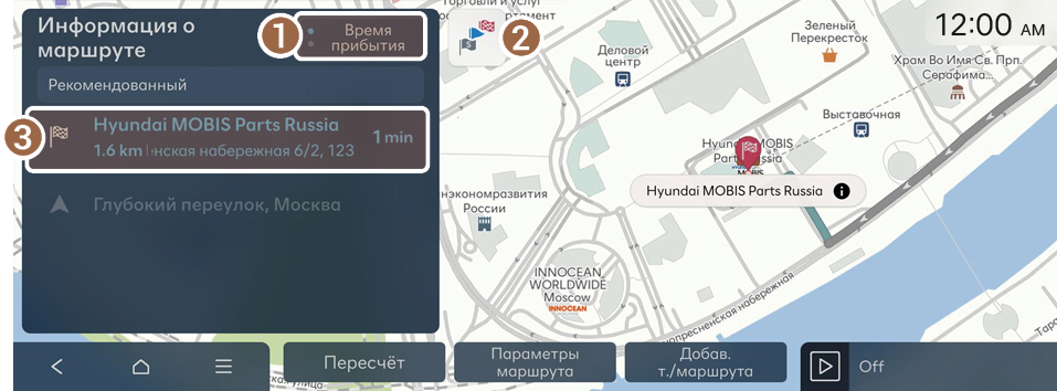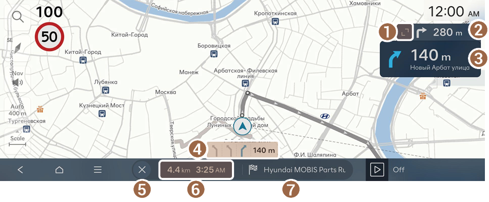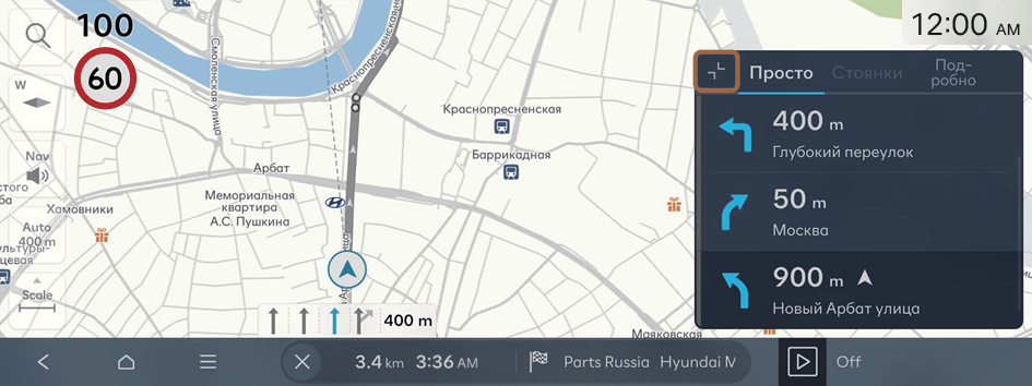 - Отображение оставшегося расстояния до пункта назначения и расчетного времени прибытия или оставшегося времени до пункта назначения. Для отображения более подробной информации нажмите на этот участок.