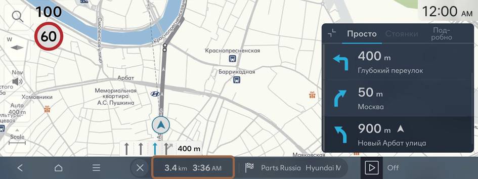 Отображение оставшегося расстояния до пункта назначения и расчетного времени прибытия или оставшегося времени до пункта назначения.