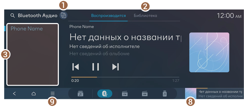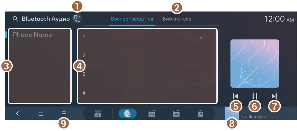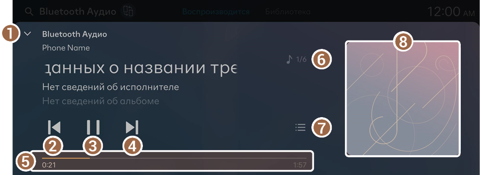 - Отображение экрана аудиопроигрывателя Bluetooth.