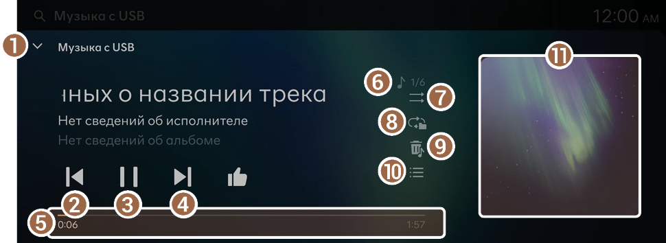 Для музыки по USB можно изменить режим повторного воспроизведения: повтор воспроизведения одного файла, повтор воспроизведения папки, повтор воспроизведения всех файлов.