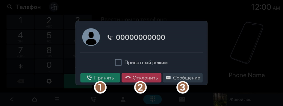 - Для ответа на вызов нажмите Принять на экране или нажмите на кнопку вызова на рулевом колесе.