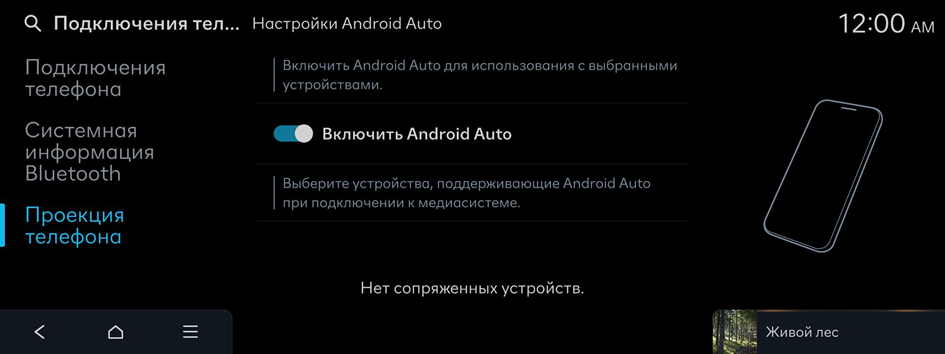 - Нажмите Настройки ▶ Подключения телефона ▶ Проекция телефона ▶ Настройки Android Auto на главном экране и затем включите Включить Android Auto.