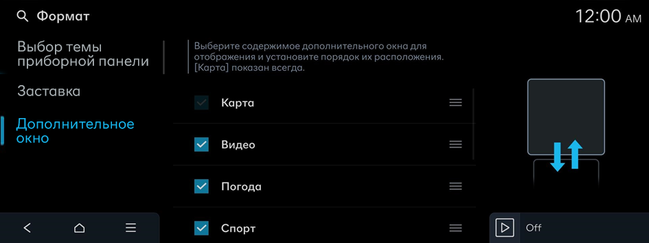 Выберите содержимое дополнительного окна для отображения и установите порядок их расположения. [Карта] показан всегда.