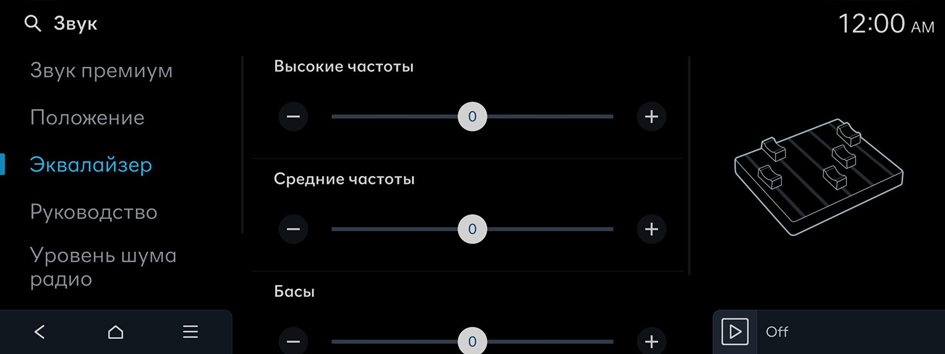 Настройте звук, отрегулировав силу (выходной уровень) для каждой аудиочастотной полосы: низкие, средние и высокие частоты.