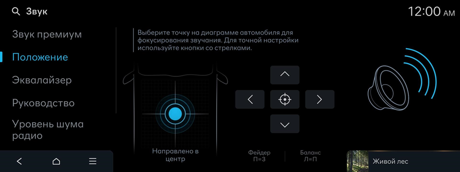 Выберите точку на диаграмме автомобиля для фокусирования звучания. Для точной настройки используйте кнопки со стрелками.