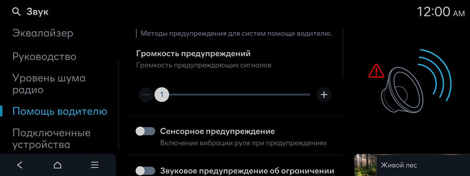Включение аудиооповещения об удержании полосы. Сигнал предупреждения невозможно отключить, если выключены тактильные предупреждения.
