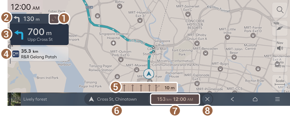 - Shows the remaining distance to the destination and the estimated time of arrival or remaining time to the destination. To view more information, press this section.
