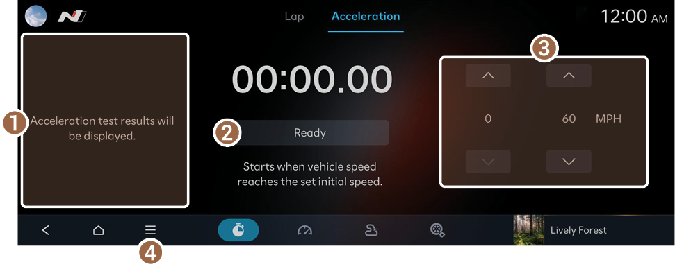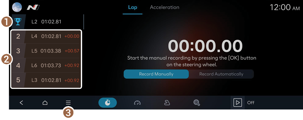 On the N Mode screen, press Lap Timer ▶ Acceleration.