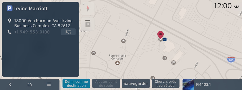 - Sélectionnez un parc de stationnement affilié à Hyundai Pay à proximité depuis l'écran de la carte, puis appuyez sur Hyundai Pay pour accéder à l'écran de paiement.