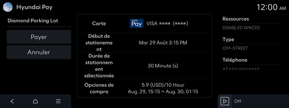 Avec votre carte de crédit enregistrée, vous pouvez payer à l'avance un bon de stationnement pour un parc de stationnement affilié à Hyundai Pay.