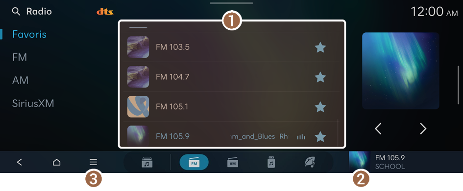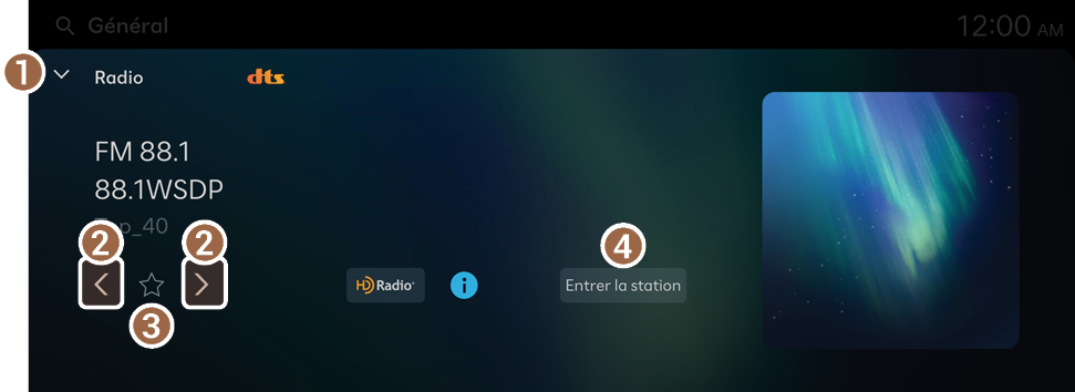 - Les noms des stations de radio et les informations locales sont affichés à la' ide des données GPS. Ces informations peuvent ne pas apparaître si le système ne reçoit pas les données GPS.