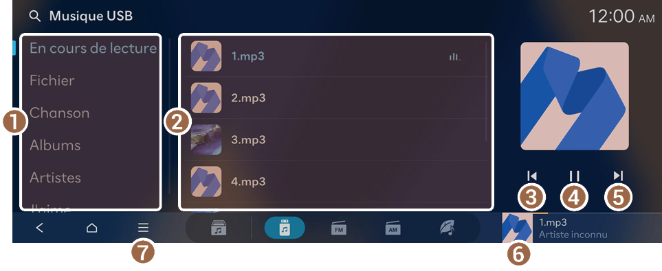 - • Sur l'écran du lecteur Musique USB, appuyez sur