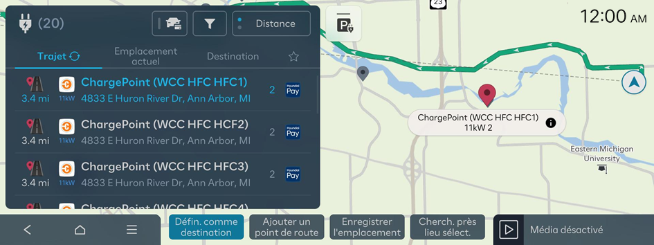 Vous pouvez vérifier la distance parcourable avec le niveau d'autonomie de la batterie. Vous pouvez également rechercher un itinéraire vers les stations de recharge à proximité, si nécessaire.