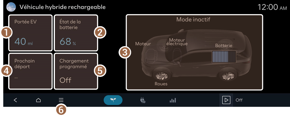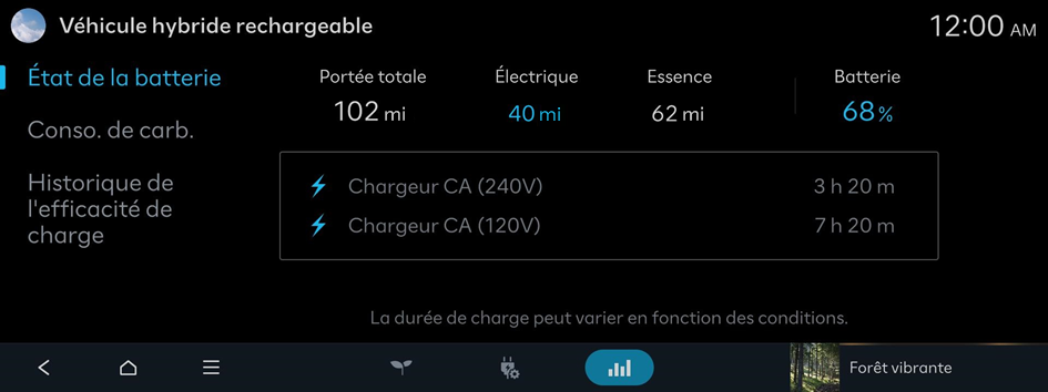 L'écran Véhicule hybride rechargeable affiche les fonctionnalités et les informations suivantes :